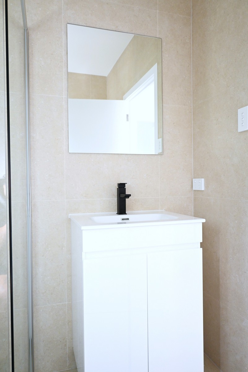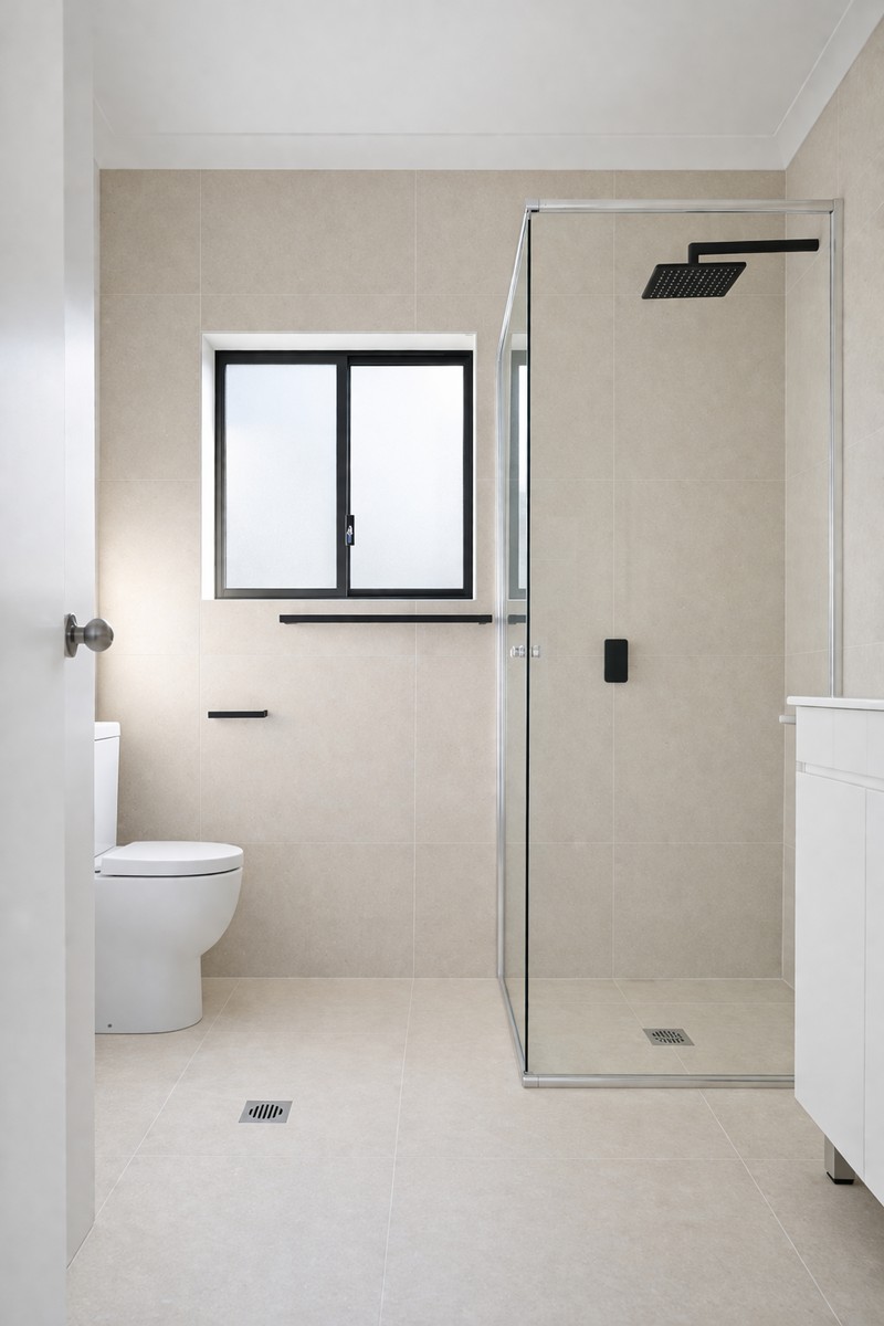 Tiled flooring runs continuously throughout the home and into the bathroom (floor-to-ceiling), creating a seamless and cohesive finish. Black hardware in the bathroom adds contrast and a modern edge to the otherwise light, neutral palette.