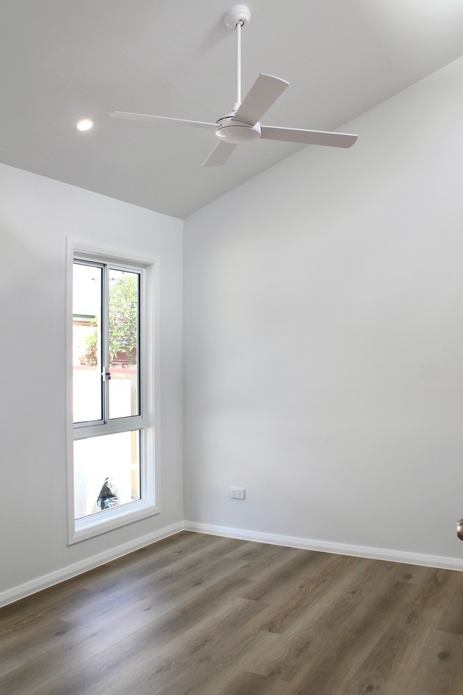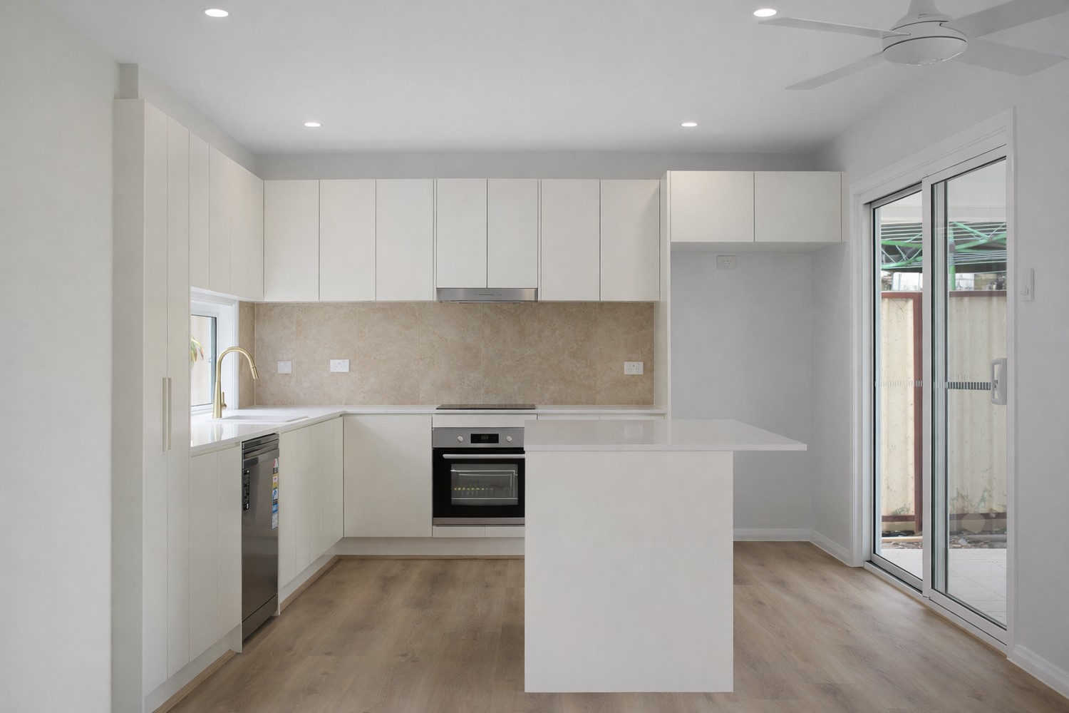 The completed granny flat features a comfortable open-plan living area with a practical kitchen, modern cabinetry, and quality appliances. A neutral colour palette and timber-look flooring create a fresh, timeless interior, while large windows improve airflow and bring in plenty of daylight. The bathroom was finished with contemporary tiling and a full glass shower for a modern look.