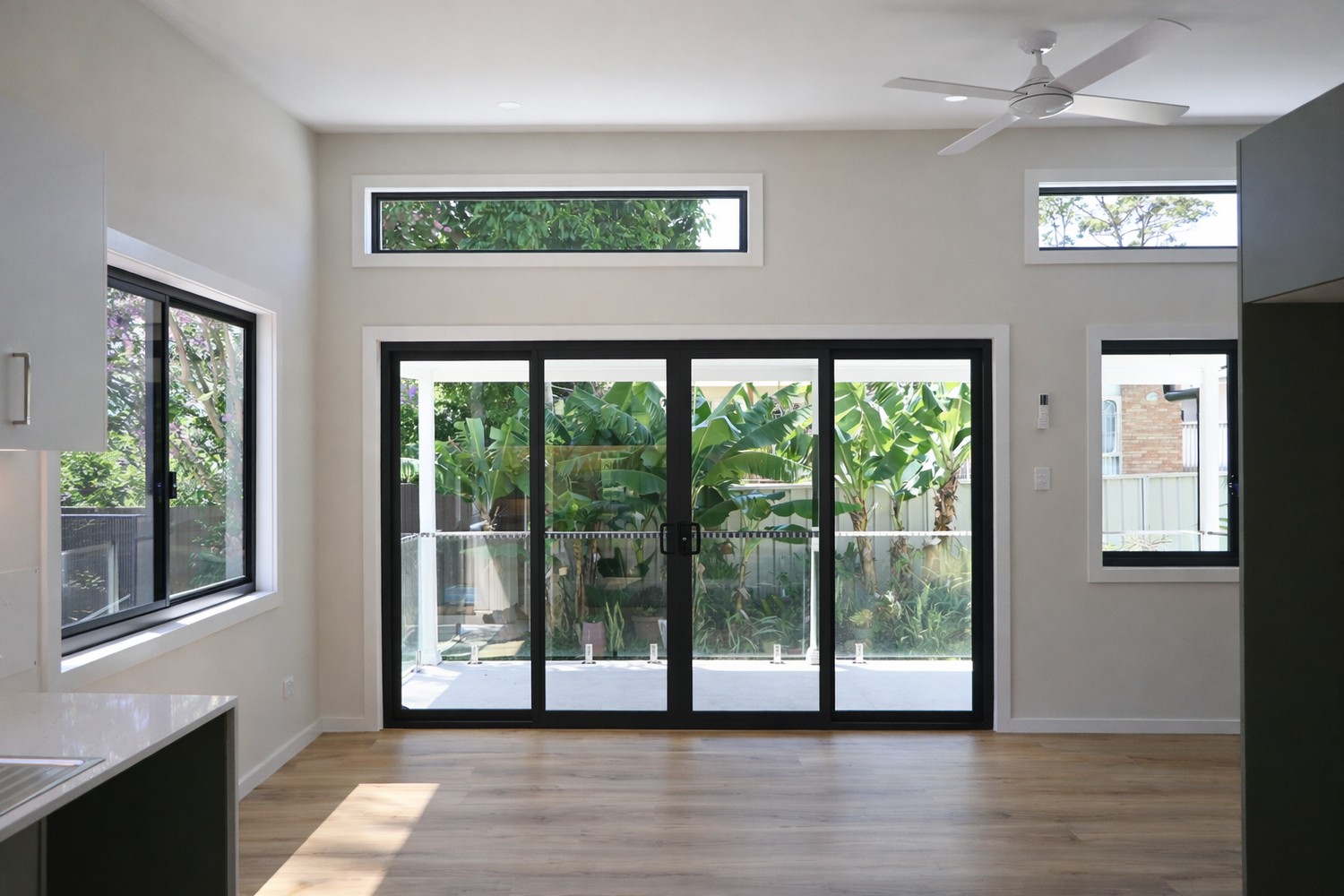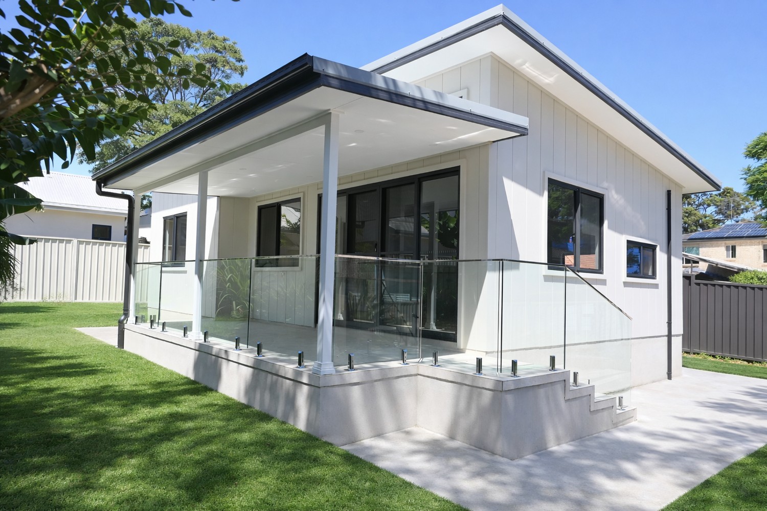 This architecturally designed granny flat in Strathfield South delivers a striking blend of modern style and everyday comfort. The home features a bold contemporary façade with clean lines, complemented by a generous elevated terrace and sleek glass balustrades that enhance both street appeal and outdoor living. Inside, the residence offers a light-filled open-plan layout with high ceilings, expansive glazing, and warm timber-look flooring, creating a bright and inviting atmosphere.